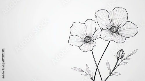 © Zeva, Naklejka premium Elegant line art cosmos flowers, white background, minimalist design, greeting card