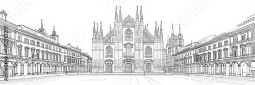 © AI Photo Stock, Obraz premium Elegant line art depicting Milan's iconic Duomo cathedral, Piazza Duomo, and surrounding architecture. Symbolizes Italian architecture, history, travel, cityscapes, and art.