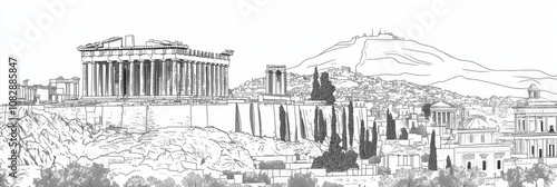 Fototapeta premium Elegant line art depicting the Acropolis, Parthenon, and Athenian cityscape. Symbolizes history, architecture, Greece, travel, and culture.
