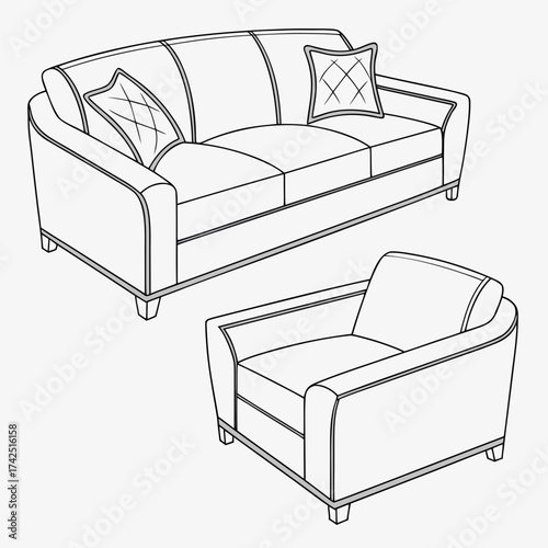 Obraz premium Elegant line drawing of a modern sofa and armchair with decorative throw pillows on a white background