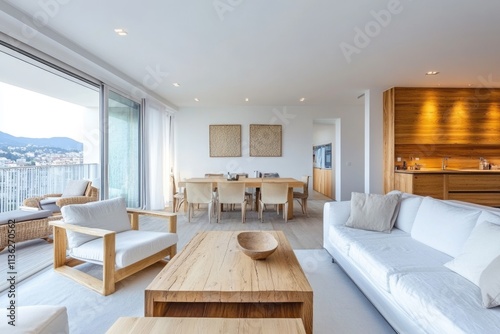 Fototapeta premium Elegant Living Room in White and Wood: Modern Interior Featuring Sofa and...
