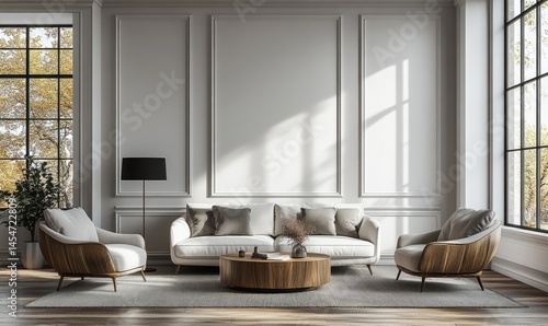 Fototapeta premium Elegant living room interior design featuring a light color palette.