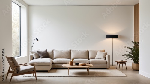 © Nima, Fototapeta premium Elegant living room with beige sectional sofa, cream pillows, floor lamp, woven rug, and potted plant on light wood floor, bright minimalist decor.