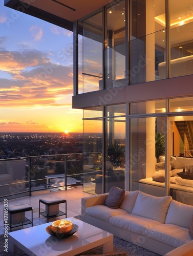 Fototapeta premium Elegant living space with a sunset city view - A high-rise apartment's...