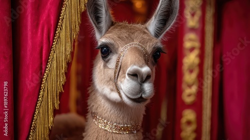 Fototapeta premium Elegant llama in luxurious red and gold setting with decorative halter and fringed curtains