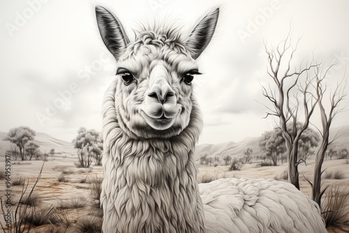 © Лариса Крохмаль, Obraz premium Elegant llama with soft fur surrounded by vibrant field flowers against a light background