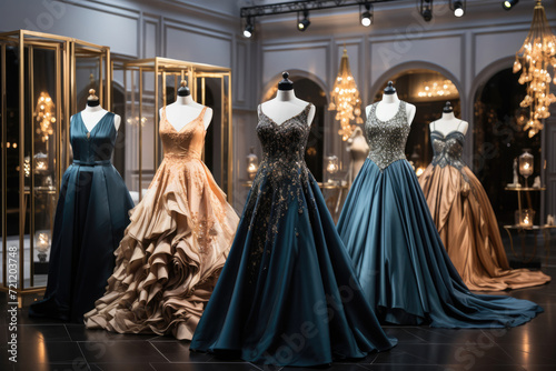 Naklejka premium Elegant luxurious dresses on mannequins in a store
