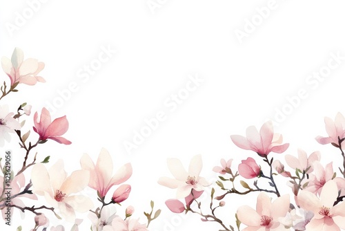 © f., Obraz premium Elegant magnolia blossoms on branches with soft pastel petals against white background
