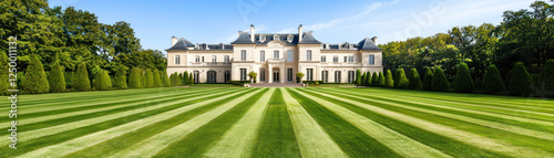 © LOMOSONIC, Naklejka premium Elegant mansion with grand entrance and perfectly manicured lawn