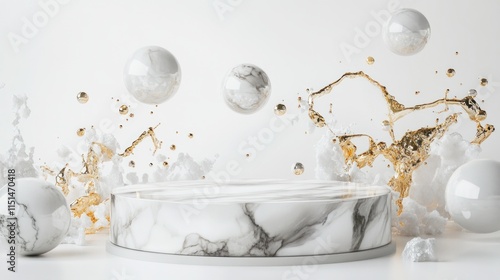 Fototapeta premium Elegant marble podium with gold liquid splash and spheres.