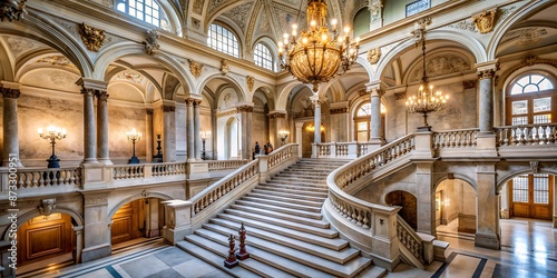 © Adisorn, Fototapeta premium Elegant marble staircase curves upward in a grand art museum, surrounded by ornate chandeliers, columns, and classical architecture, bathed in soft, natural light.