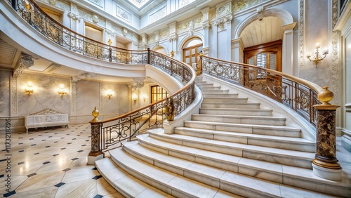 © Adisorn, Fototapeta premium Elegant Marble Staircase: Panoramic View of Ornate Balustrades & Polished Steps