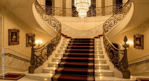 © Tiu, Fototapeta premium Elegant Marble Staircase with Red Carpet and Ornate Gold Railings and Chandelier