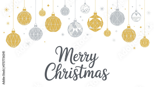 Fototapeta premium Elegant merry christmas greeting with hanging ornaments and snowflakes