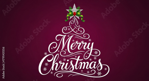 © Ashish, Naklejka premium Elegant merry christmas lettering in a festive tree shape with a star and ornaments on a deep purple background