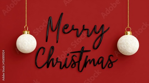 © Diffin, Naklejka premium Elegant "Merry Christmas" text with two white ornaments on a red background, evoking festive holiday spirit and celebration.