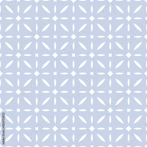© Olgastocker, Naklejka premium Elegant minimal seamless background. Vector geometric floral pattern with diamonds, flowers, leaves, grid, lattice. Simple light blue abstract ornament in oriental style. Subtle repeating geo design