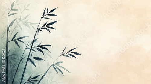 © Digital Design, Naklejka premium Elegant minimalist painting of bamboo stalks and leaves on a beige textured background, evoking calm and natural beauty.