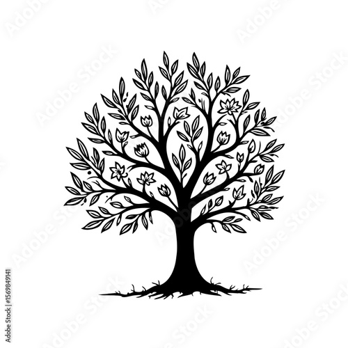 © Rahma, Obraz premium Elegant minimalist tree illustration featuring delicate floral accents and graceful branches for tranquil design projects or decorative elements
