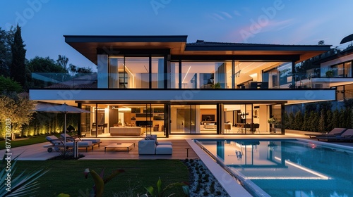© rui, Obraz premium Elegant Modern Dining Room with Nighttime Ambiance and Outdoor Views