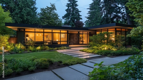 Fototapeta premium Elegant Modern Home Surrounded by Lush Greenery