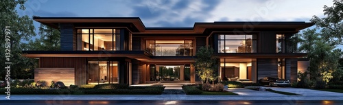 © Alfan Mask, Obraz premium Elegant Modern House Architecture with Warm Lighting and Landscaped Exterior