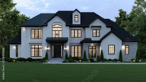 © pvl0707, Obraz premium Elegant modern house with a landscaped yard at dusk showcasing contemporary architectural design and inviting ambiance