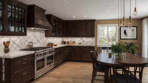 Fototapeta premium Elegant modern kitchen featuring dark wood cabinetry, a marble backsplash,...