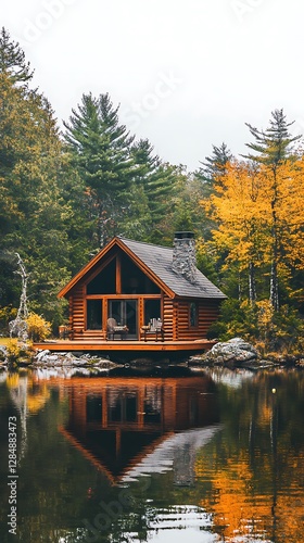 © Mukta, Fototapeta premium Elegant modern lodge with panoramic forest views and fireplace