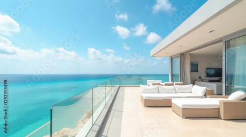 Fototapeta premium Elegant Modern Terrace Overlooking Crystal Clear Ocean View