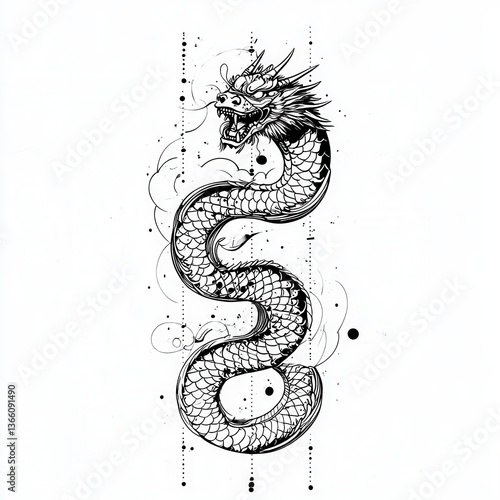© Tungbackground, Fototapeta premium Elegant Monochrome Dragon Tattoo Design with Ink Splatter Background