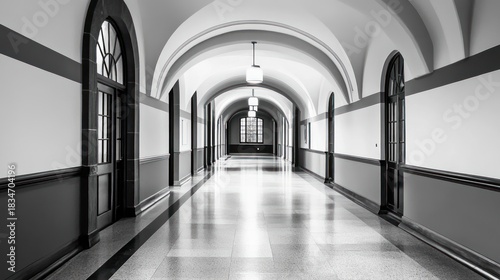 Obraz premium Elegant monochrome perspective view of a long, arched architectural hallway