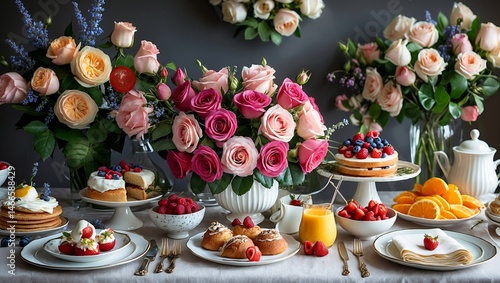 © Artem, Fototapeta premium Elegant mother's day brunch with floral centerpiece