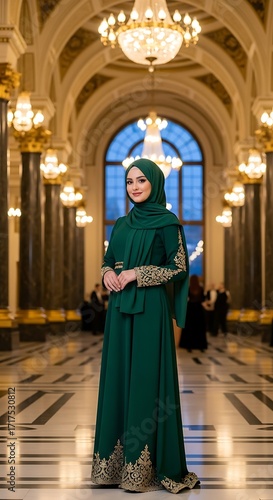 Naklejka premium Elegant Muslim Woman in Emerald Green Gown.