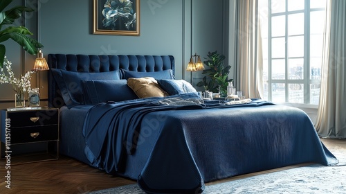 © Milaballe, Obraz premium Elegant navy blue bedroom with luxurious bedding and modern decor accents