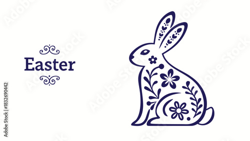 © Vector Nest, Fototapeta premium Elegant navy blue easter bunny silhouette adorned with floral patterns sits beside the word easter in a decorative font on a clean white background