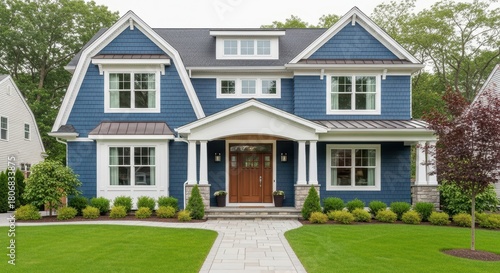 © Chainarong, Fototapeta premium Elegant Navy Blue House A Picture-Perfect Two-Story Home with Stone Path