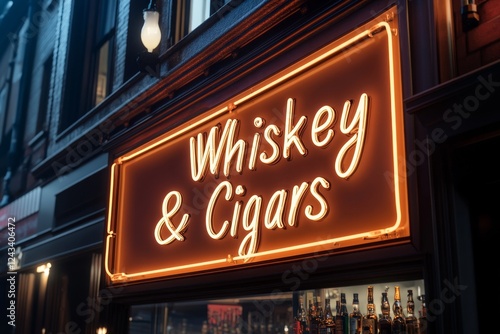 Obraz premium Elegant neon sign glowing invitingly over a whiskey and cigar shop at night...