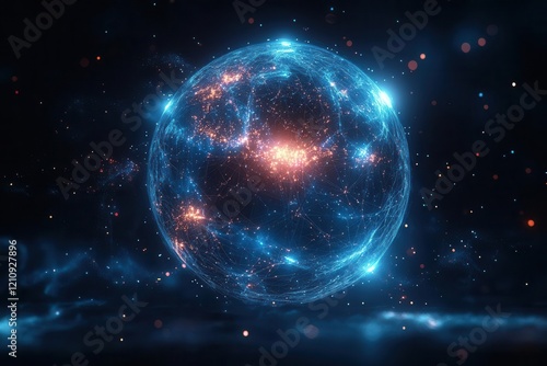 © Vesna, Obraz premium elegant network visualization with glowing blue connections across translucent globe dark background with dynamic data streams and geometric patterns