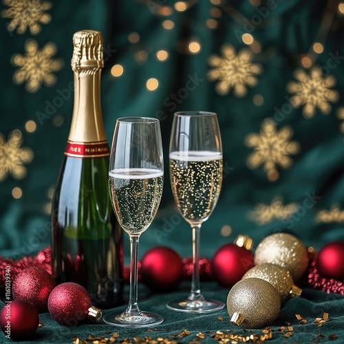 Fototapeta premium Elegant New Year and Christmas Toast with Champagne Bottle, Glass of...