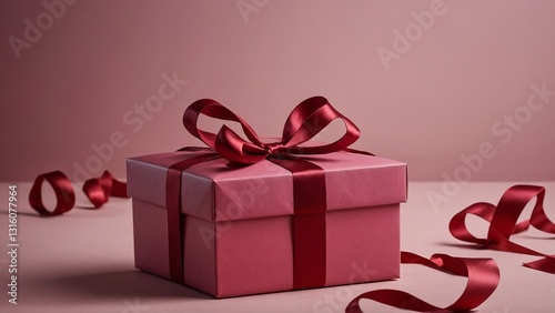 © Nikolai, Fototapeta premium Elegant opened red gift box with a bow floating on a pink background, perfect for celebrations and special occasions