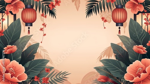 Naklejka premium Elegant Oriental floral background with lanterns, featuring lush green leaves...