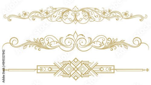 © Mr.KSP, Fototapeta premium Elegant ornamental vector elements with golden floral, calligraphic, and Art Deco text dividers