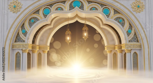 © widhihutomo, Obraz premium Elegant Ornate Islamic Archway with Lanterns Religious Greeting Decorative Background