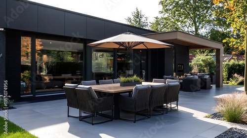 Fototapeta premium Elegant outdoor dining area featuring a stylish table and umbrella surrounded...