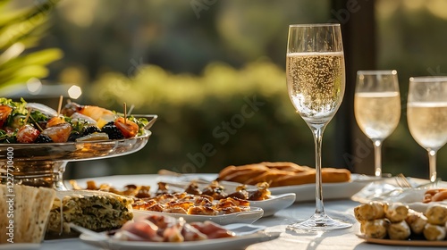 © Naseer, Fototapeta premium Elegant outdoor gathering with sparkling wine and delicious appetizers on a sunny day