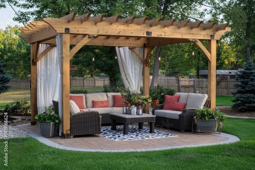 Obraz premium Elegant Outdoor Pergola with Cozy Seating Area and Decor Features