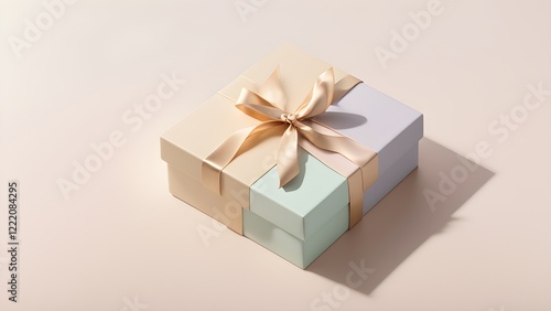 Obraz premium Elegant pastel gift box with gold ribbon on beige background.