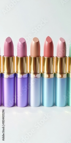 © Ilja, Obraz premium Elegant Pastel Spectrum of Beauty Supplies Featuring Delicate Color Lipsticks for Artistic Glamour