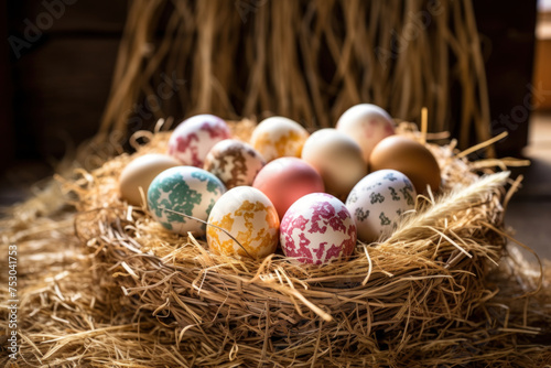 Fototapeta premium Elegant patterned Easter eggs in a straw nest